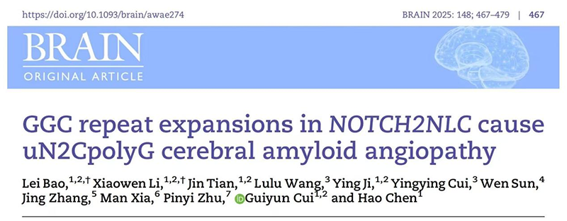 黃淮網 在江蘇省高水平建設醫(yī)院項目的有力支持下,2025年2月,徐州醫(yī)科大學附屬醫(yī)院神經內科崔桂云教授、陳浩副教授團隊取得重大科研突破。其研究成果以論著形式,在線發(fā)表于國際神經病學領域的頂刊《Brain》。論文題目為“GGC Repeat Expansions in NOTCH2NLC Cause uN2CpolyG Cerebral Amyloid Angiopathy”,屬于原創(chuàng)性研究成果。在這篇論文中,崔桂云教授、陳浩副教授為并列通訊作者,鮑磊博士和李曉文碩士為共同第一作者,徐州醫(yī)科大學附屬醫(yī)院既是第一單位,也是第一通訊單位。
