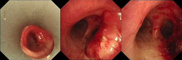 麻醉科高淑萍主任全程保障與密切配合,通過采用高頻-常頻疊加噴射通氣支持,有效保障患者術中通氣和維持氧合穩(wěn)定。 呼吸與危重癥醫(yī)學科孫理想主任帶領呼吸內(nèi)鏡團隊為患者實施全麻硬鏡下腫瘤氣道消融術。由于患者腫瘤浸潤廣泛,基底寬大,先以硬鏡快速鏟切清除瘤體解除氣道梗阻,再以氬氣刀精準消融基底殘余腫瘤并有效止血,經(jīng)過20分鐘鏡下治療,氣道腫瘤基本清除,順利開通氣道,大大縮短手術時間,術后患者咯血癥狀消失,呼吸順暢,將根據(jù)病理明確診斷進行后續(xù)治療。
