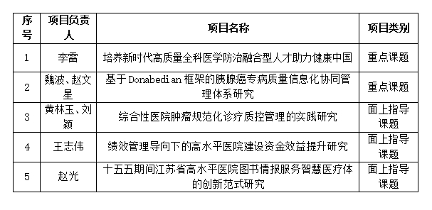 此次入選的五項(xiàng)課題,緊密對(duì)接國家深化醫(yī)改戰(zhàn)略、公立醫(yī)院高質(zhì)量發(fā)展要求以及我院建設(shè)區(qū)域醫(yī)院管理創(chuàng)新中心的戰(zhàn)略目標(biāo),涵蓋高層次人才建設(shè)、病案質(zhì)量管理、醫(yī)療質(zhì)量管理和績效管理等核心領(lǐng)域。此次立項(xiàng)不僅彰顯了徐醫(yī)附院對(duì)政策導(dǎo)向與行業(yè)需求的精準(zhǔn)把握,更體現(xiàn)了在現(xiàn)代醫(yī)院管理創(chuàng)新路徑上的積極探索與實(shí)踐。