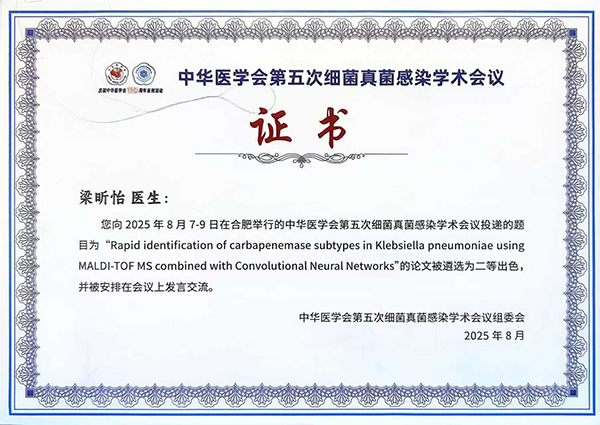 本次會(huì)議聚焦細(xì)菌與真菌感染的流行病學(xué)、耐藥監(jiān)測(cè)、快速病原學(xué)診斷及感染防控等核心議題。徐醫(yī)附院醫(yī)學(xué)檢驗(yàn)科積極組織學(xué)術(shù)投稿,共提交論文13篇。經(jīng)大會(huì)評(píng)審,其中6篇入選壁報(bào)交流,1篇入選大會(huì)“優(yōu)秀論文”發(fā)言環(huán)節(jié),并在最終評(píng)選中榮膺大會(huì)“優(yōu)秀論文二等獎(jiǎng)”。