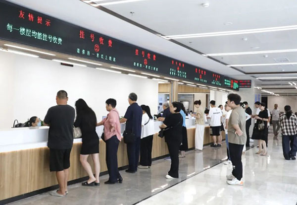 新院區(qū)門診大廳整潔明亮,環(huán)形導(dǎo)診臺(tái)前已有不少市民前來咨詢。大廳兩側(cè)整齊排列著嶄新的自助設(shè)備,身穿紅色馬甲的導(dǎo)診人員正協(xié)助患者進(jìn)行掛號、繳費(fèi)和報(bào)告打印等操作。走廊深處的西藥房開設(shè)五個(gè)窗口,市民依次排隊(duì),秩序井然。開診首日,各科室運(yùn)轉(zhuǎn)順暢,配套設(shè)備完善、環(huán)境舒適寬敞、流程便捷高效,為市民帶來了全新的就醫(yī)體驗(yàn)。