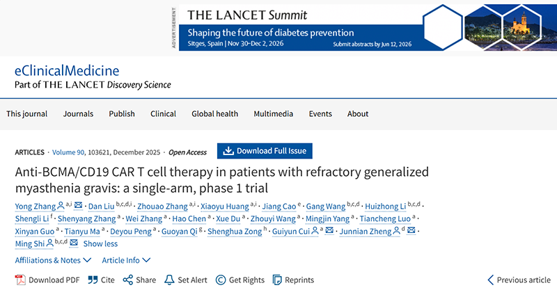 《eClinicalMedicine》隸屬于“柳葉刀-發(fā)現(xiàn)科學(xué)”(The LancetDiscovery Science)系列,致力于整合全球前沿醫(yī)學(xué)成果,推動(dòng)醫(yī)療實(shí)踐與衛(wèi)生系統(tǒng)革新。該期刊以其高權(quán)威性享譽(yù)全球,通過發(fā)布具有重要臨床意義的早期研究證據(jù),助力科研人員與臨床醫(yī)生發(fā)現(xiàn)改善人類健康與福祉的新機(jī)遇。值得一提的是,徐醫(yī)附院此前報(bào)道的國(guó)際首例雙特異性CAR-T治療案例,已被《中國(guó)重癥肌無力診斷和治療指南(2025版)》收錄為參考文獻(xiàn),彰顯了國(guó)內(nèi)學(xué)界對(duì)該研究的高度認(rèn)可。此次Ⅰ期研究成果再獲國(guó)際頂級(jí)平臺(tái)認(rèn)可,標(biāo)志著徐醫(yī)附院在該領(lǐng)域的探索已達(dá)到國(guó)際先進(jìn)水平。