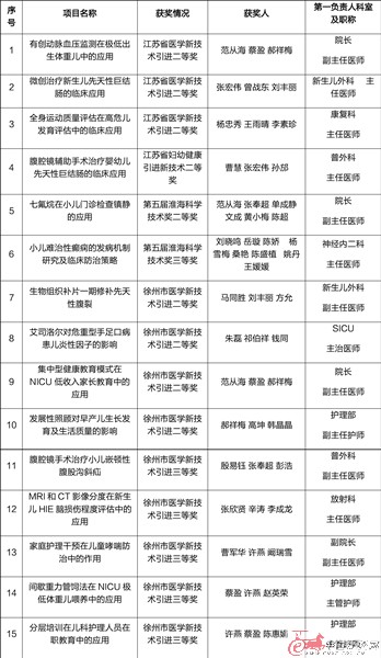 全年獲得江蘇省醫(yī)學(xué)新技術(shù)引進(jìn)獎4項,淮?茖W(xué)技術(shù)獎2項,徐州市醫(yī)學(xué)新技術(shù)引進(jìn)獎9項,徐州市科技情報成果獎1項,共15項。