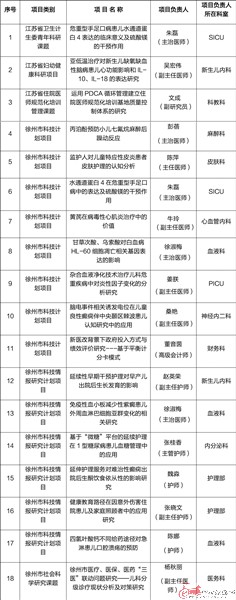 全年獲江蘇省衛(wèi)計委科研課題1項,江蘇省婦幼健康科研項目1項,江蘇省住院醫(yī)師規(guī)范化培訓(xùn)管理課題1項,徐州市科研項目8項,徐州市科技情報課題6項,徐州市社會科學(xué)研究課題1項,共18項。