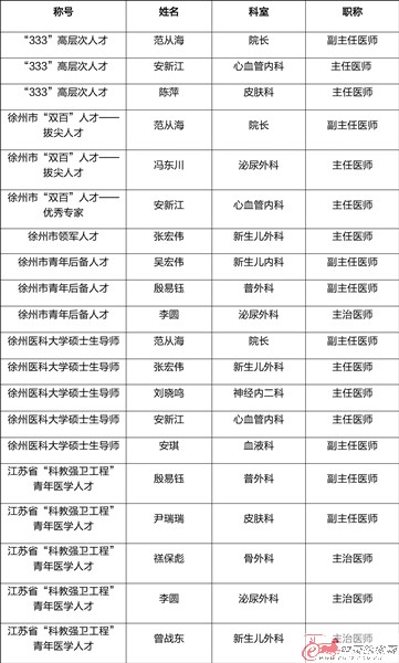 我院現(xiàn)有“333”人才3名,“雙百”人才2名,優(yōu)秀專家1名,領(lǐng)軍人才1名,青年后備人才3名,徐州醫(yī)科大學(xué)碩士生導(dǎo)師3名,2016年我院5名醫(yī)師成功評為江蘇省“科教強(qiáng)衛(wèi)工程”青年醫(yī)學(xué)人才。