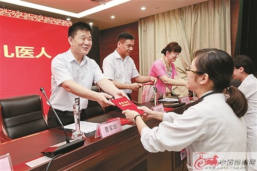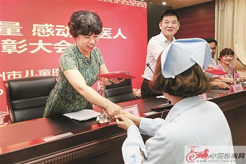 市兒童醫(yī)院院長(zhǎng)曹軍華給獲獎(jiǎng)?wù)哳C獎(jiǎng)