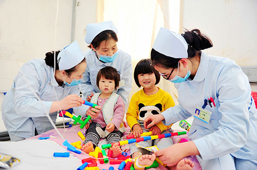 除了日常的換藥、打針等常規(guī)工作,兒科的護士們也沒有放下為患兒及家長提供優(yōu)質(zhì)服務(wù)的“弦”。稍有空閑時,護士們就會現(xiàn)身說教,為小患者做按摩、理療、語言引導(dǎo)等一系列功能訓(xùn)練,以便及時消除患兒的恐懼心理。同時,對于患兒家長提出的各種疑問,護士們也會耐心細致的解釋,并親身示范、指導(dǎo)家長給孩子母乳喂養(yǎng)、翻身、叩背及健康宣教等工作,她們全心全意為幼小的孩子們除去病痛提供力所能及的幫助。
