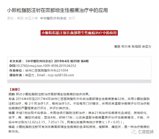 2019年4月,中華醫(yī)學(xué)會主辦的整形外科專業(yè)學(xué)術(shù)期刊《中華整形外科雜志》刊登仁慈醫(yī)美宗亞力院長、張旭陽院長、黃振主任、鄭大偉主任合作撰寫的重要學(xué)術(shù)論文《小顆粒脂肪注射在面部增生性瘢痕治療中的應(yīng)用》。研究結(jié)果顯示小顆粒脂肪注射可有效改善面部增生性瘢痕的色澤和質(zhì)地,是一種治療瘢痕的新方法。