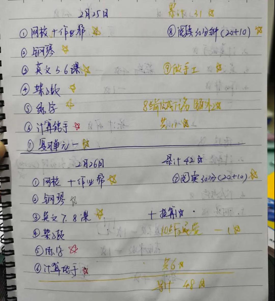 翻開王雨晴的記錄本,她給女兒布置的任務(wù)可不少,比如2月25日就有9項(xiàng)任務(wù):1、網(wǎng)校+作業(yè)幫,2、鋼琴,3、英文5、6課,4、架子鼓,5、練字,6、計(jì)算能手,7、復(fù)習(xí)單元,8、閱讀30分鐘,9、做手工。