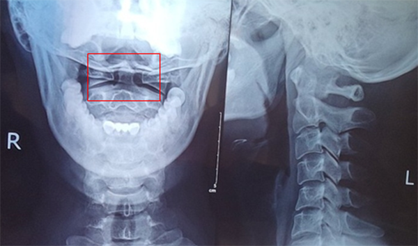 頸椎X線檢查結(jié)果:頸椎生理曲線變直、寰枕間隙略窄,鉤椎關(guān)節(jié)增生,右側(cè)寰齒間距窄,兩側(cè)寰齒間距差值大于2mm,左側(cè)寰椎側(cè)塊較右側(cè)略寬(見圖紅框中)。
