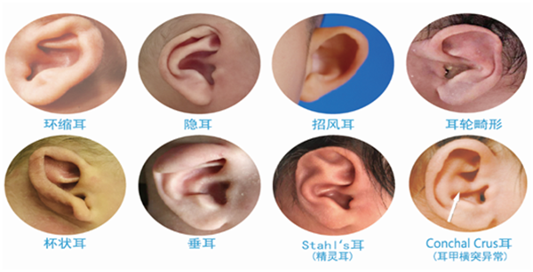 形態(tài)畸形可分為多種,包括:招風(fēng)耳、隱耳、杯狀耳、垂耳、Stahl’s耳、環(huán)縮耳、耳輪畸形、Conchal crus耳、復(fù)合畸形等。