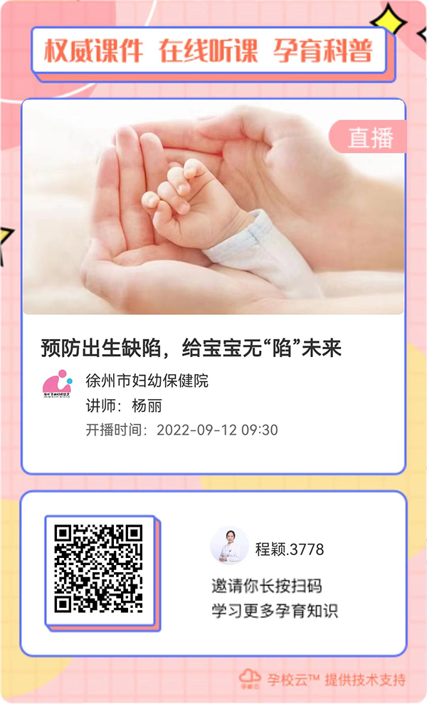 如果您想了解更多預(yù)防出生缺陷知識(shí),請(qǐng)按時(shí)參加徐州市婦幼保健院的婦幼云學(xué)堂《預(yù)防出生缺缺陷,給寶寶無“陷”未來》直播課吧~