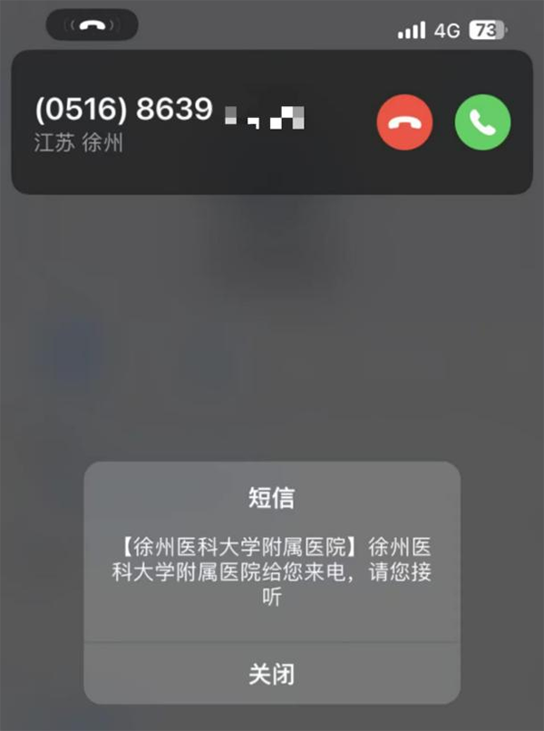 若電話顯示0516-8639開頭(徐州醫(yī)科大學(xué)附屬醫(yī)院)來電,請您可以放心接聽,這是醫(yī)院智能隨訪平臺撥打的電話,為您提供主動(dòng)、個(gè)性化的醫(yī)療服務(wù)。智能號碼僅能外呼,無法回?fù),若您在隨訪過程中有問題沒有得到解決,您可在復(fù)診時(shí)咨詢醫(yī)生。
