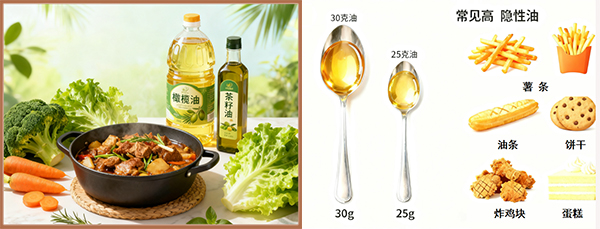 科學控油的核心在于選對油品、合理食用且適量攝入。建議優(yōu)選植物油,并識破食物中的隱性油脂。推薦使用橄欖油、茶籽油(富含單不飽和脂肪酸)、山茶油、低芥酸菜籽油進行涼拌或快炒,同時可搭配亞麻籽油、紫蘇籽油(富含Omega-3)用于涼拌。應限制攝入豬油、黃油、奶油等飽和脂肪以及人造黃油、起酥油等反式脂肪。根據(jù)《中國居民膳食指南》的建議,每人每天烹調(diào)油的攝入量應控制在25~30克,約相當于白瓷勺 2-3平勺。此外,還需警惕烘焙糕點(如酥皮點心、餅干、蛋撻)、加工零食(如薯片、膨化食品),紅燒、干鍋、油炸、干煸類菜肴以及肥肉、肉皮、動物內(nèi)臟等隱性油脂來源。