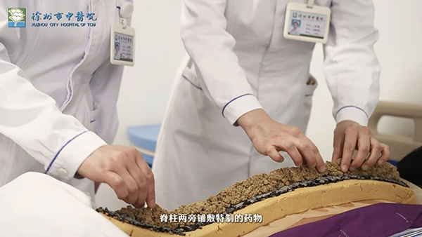 2. 中藥粉鋪設 在督脈上均勻撒上中藥粉,根據病癥調配,或涂抹生姜油以增強效果。