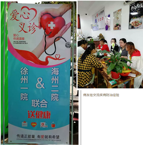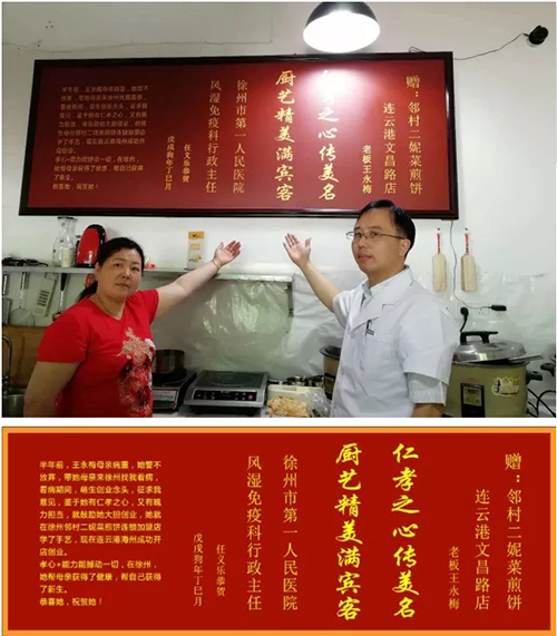 考慮到天氣炎熱,任義樂主任利用周末休息時間,于6月10日赴連云港,為王永梅母親延續(xù)醫(yī)療隨訪服務(wù),并贈送王永梅 “仁孝之心傳美名·廚藝精美滿賓客”的牌匾?吹嚼先松詈途穸己,任主任放心了。同時,和連云港二院積極溝通,攜手連云港二院風(fēng)濕免疫科在連云港海州鄰村二妮菜煎餅文昌路店開展義診活動。