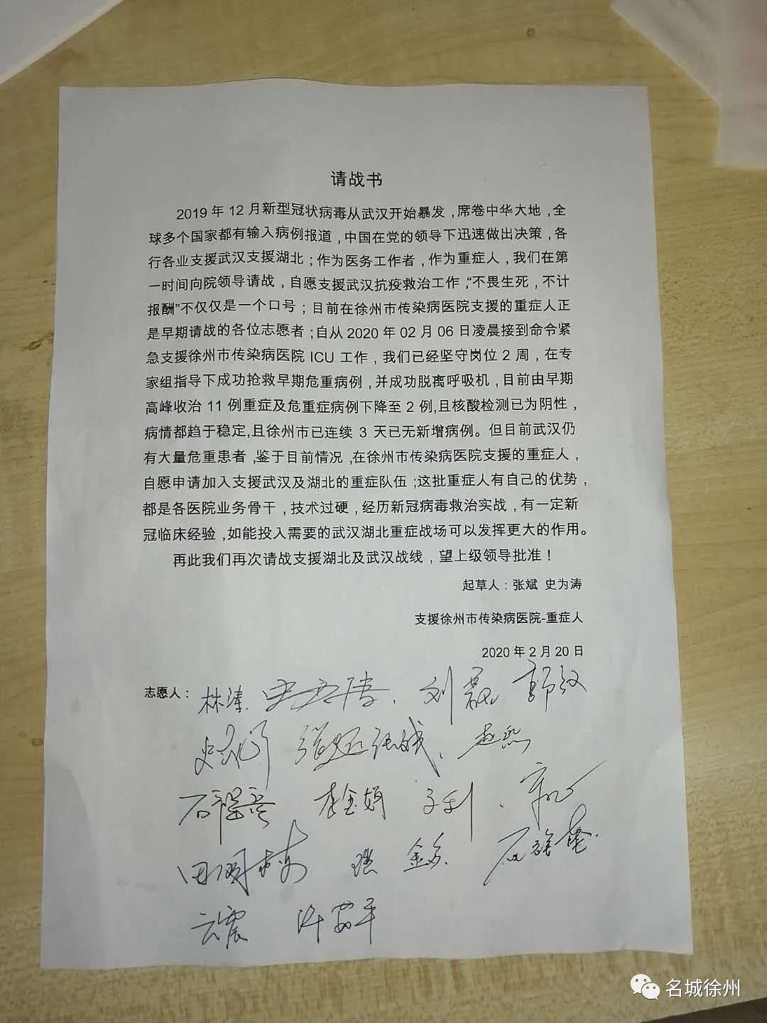 截至2月25日,徐州市傳染病醫(yī)院重癥監(jiān)護(hù)室僅剩的兩名患者均已轉(zhuǎn)為普通型病例,相信不久,“天團(tuán)們”就會(huì)完成使命。記者了解到,這9名勇士,早在2月20日,已經(jīng)再次寫下請(qǐng)戰(zhàn)書,請(qǐng)求下一步支援湖北及武漢。“我們有一定的新冠臨床經(jīng)驗(yàn),希望可以到湖北、武漢重癥戰(zhàn)場(chǎng),發(fā)揮更大的作用!”請(qǐng)戰(zhàn)書上滿滿的簽字,“林濤”的名字寫在最前面。