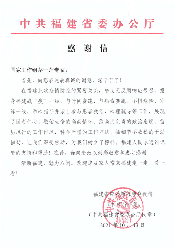 在福建疫情防控的緊要關頭,茅一萍義無反顧投身福建戰(zhàn)“疫”一線,與時間賽跑、與病毒賽跑,悉心指導并親自參與患者教治、心理疏導等工作,展現(xiàn)了醫(yī)者仁心,敬佑生命的高尚情懷。
