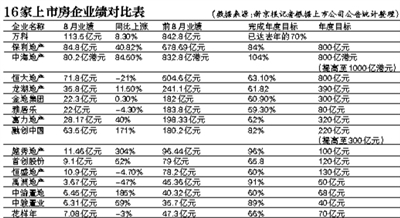 8月剛過,上市房企紛紛公布8月銷售月報(bào)。從記者統(tǒng)計(jì)的16家房企來看,共有11家業(yè)績同比上漲,房企業(yè)績普漲趨勢(shì)明顯。而從1-8月累計(jì)的數(shù)據(jù)來看,中海地產(chǎn)、保利地產(chǎn)銷售額已接近700億元,緊跟萬科身后,沖刺千億銷售總額的可能性非常大。