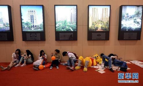 5月18日,杭州人居展上,推銷樓盤的工作人員在房交會現(xiàn)場的樓盤燈箱廣告下休息。 5月17日至19日,一年一度的杭州最佳人居展舉行,共有39家房企參展。在樓市銷售不佳,房屋庫存居高不下的環(huán)境下,本屆房交會上的參展房企開始打響了史無前例的“房屋銷售戰(zhàn)”,除了打折、存抵、優(yōu)惠等傳統(tǒng)營銷手段外,參展房企開始雇傭大量的樓盤宣傳人員,發(fā)傳單、美女走秀、動漫巡游、現(xiàn)場音樂會等新式手段極力推銷旗下的樓盤。然而,購房者在“樓市降價(jià)預(yù)期”的影響下,則選擇了冷靜地觀望。一頭熱,一頭冷成了今年杭州房交會最明顯的反差。據(jù)當(dāng)?shù)孛襟w統(tǒng)計(jì),房交會首日僅一套房子成交。新華社記者 王定昶攝