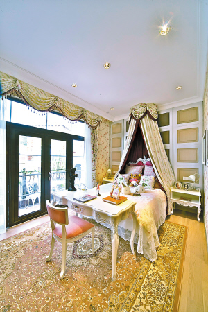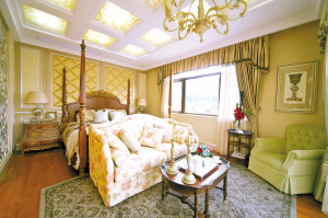 主臥:進(jìn)門(mén)口的鏤空木質(zhì)玄關(guān),有效的區(qū)分了房間與走廊的區(qū)域。主臥延續(xù)了整體的歐式裝修風(fēng)格,實(shí)木四柱床,一般在歐式古典城堡能夠看到,天花板用雕花描金玻璃進(jìn)行造型吊頂,為房間創(chuàng)造出溫馨浪漫的氣氛的同時(shí),更體現(xiàn)出雍容華貴的生活。主臥的露臺(tái)非常明快敞亮,躺在躺椅上,讓人身心愉悅。