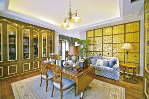 三層還有一個家庭式書房,木質金色鏤空隔斷,使得書房空間通透感更強,而且樓梯間的采光效果也非常好。此外,在此還預留了一間古董收藏室,體現(xiàn)主人的貴重收藏品的收藏功能。
