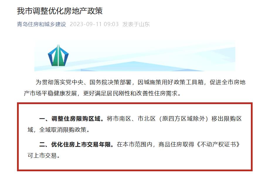 青島市調(diào)整優(yōu)化房地產(chǎn)政策:全域取消限購(gòu)