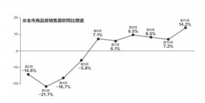 京華時(shí)報(bào)訊(記者顧夢琳)昨天,北京市統(tǒng)計(jì)局、國家統(tǒng)計(jì)局北京調(diào)查總隊(duì)發(fā)布前11月北京主要經(jīng)濟(jì)數(shù)據(jù)。數(shù)據(jù)顯示,前11月,全市商品房銷售面積比上年同期增長14.2%,增幅較前10月大幅提高7個(gè)百分點(diǎn),創(chuàng)年內(nèi)新高。
