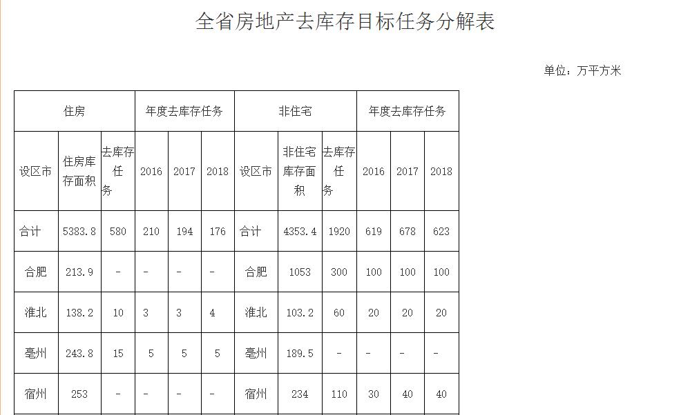 安徽省設區(qū)市住房庫存面積接近5400平方米,占全省商品房庫存量比重為55%,去庫存任務為580萬平方米,分解到未來3年的年度去庫存任務分別為210萬平方米、194萬平方米、176萬平方米。