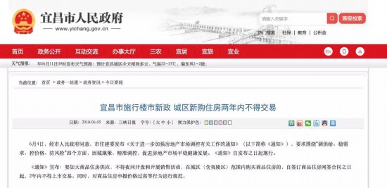 6月3日深夜,湖北宜昌下發(fā)《關(guān)于進一步加強房地產(chǎn)市場調(diào)控有關(guān)工作的通知》,明確宣布:自本通知施行后,在城區(qū)(含夷陵區(qū))范圍內(nèi)購買商品住房的,自簽訂商品住房網(wǎng)簽合同之日起,2年內(nèi)不得上市交易。