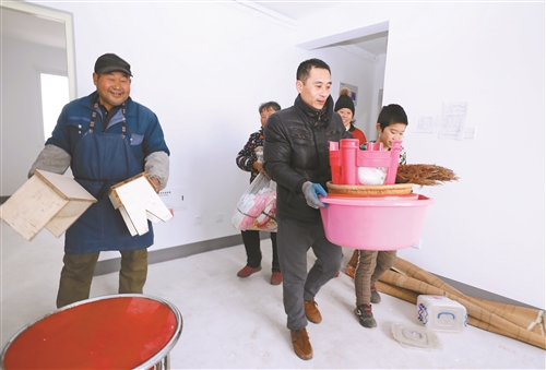 居民姚煥生一家5口人,分得小區(qū)大門西側(cè)一棟18層高樓一單元1301室。上午10時許,祖孫三代拿著搬家物品高高興興地來到新家。