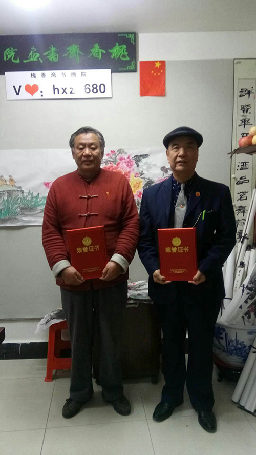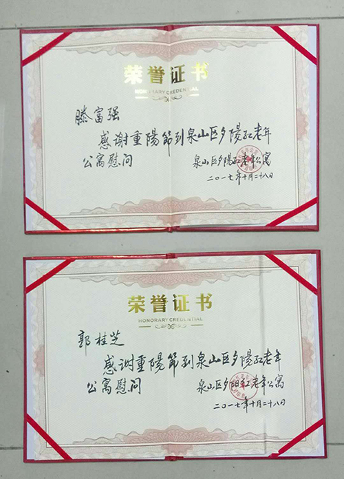 中國(guó)黃淮網(wǎng)訊 特約通訊員張友臣 1O月30日上午,江蘇省徐州市泉山區(qū)夕陽(yáng)紅老年公寓為槐香齋藝術(shù)顧問(wèn)滕富強(qiáng)和徐州市敬老模范郭桂芝頒發(fā)榮譽(yù)證書,感謝他們?cè)?/span>2017年重陽(yáng)節(jié)期間送去祝福和溫暖,當(dāng)場(chǎng)為老人們寫書法壽字贈(zèng)送并演唱歌曲,讓老人們快樂(lè)開心。
