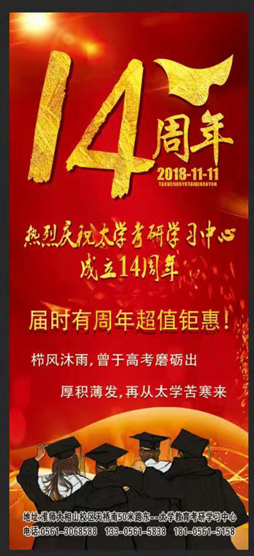 14年風(fēng)雨同舟,從“星航”到“太奇”再到“太學(xué)”。14年中幫助一大批學(xué)子進(jìn)入了心儀的高校讀研。11月11日,淮北太學(xué)教育將迎來建校十四周年慶典。