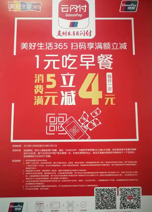活動(dòng)內(nèi)容:活動(dòng)期間,持卡人到指定商戶用餐,通過(guò)云閃付APP”付款即可享受滿5元立減4元優(yōu)惠;顒(dòng)期間每天優(yōu)惠名額限定為1000名,每個(gè)云閃付APP用戶每天限用一次,先到先得用完為止,如當(dāng)天名額未使用完畢則轉(zhuǎn)結(jié)下一個(gè)活動(dòng)日;活動(dòng)期間共計(jì)60000個(gè)名額。