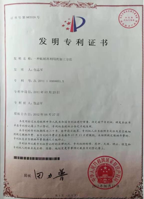為了實(shí)現(xiàn)自己的“夢(mèng)想”,包志軍從少年思考到青年,從青年摸索到中年,從中年研究到現(xiàn)在,把自己寶貴的青春和全部精力都獻(xiàn)給了“蚯蚓事業(yè)”。他自建化驗(yàn)室,自畫圖紙,自制設(shè)備,終于從蚯蚓體內(nèi)提取出了蚯蚓纖溶酶、蚯蚓素、蚯蚓蛋白、蚯蚓氨基酸......包志軍把提取的這些蚯蚓成分送往國家認(rèn)定的檢測(cè)機(jī)構(gòu)檢測(cè),經(jīng)檢測(cè)確認(rèn)這些成分藥用價(jià)值可觀且安全環(huán)保,可運(yùn)用于醫(yī)藥臨床試驗(yàn)。在當(dāng)時(shí),他的成果超過了許多專業(yè)蚯蚓研究機(jī)構(gòu)的研究水平,于是包志軍決定申報(bào)國家專利,2012年6月27日國家專利局向包志軍頒發(fā)了《一種蚯蚓再利用的加工方法》發(fā)明專利證書(專利號(hào):ZL.201110069953.X)。專利證書標(biāo)明包志軍所提取出的蚯蚓蛋白質(zhì)、蚯蚓氨基酸、蚯蚓色素、蚯蚓纖溶酶等物質(zhì),可以直接進(jìn)行使用。