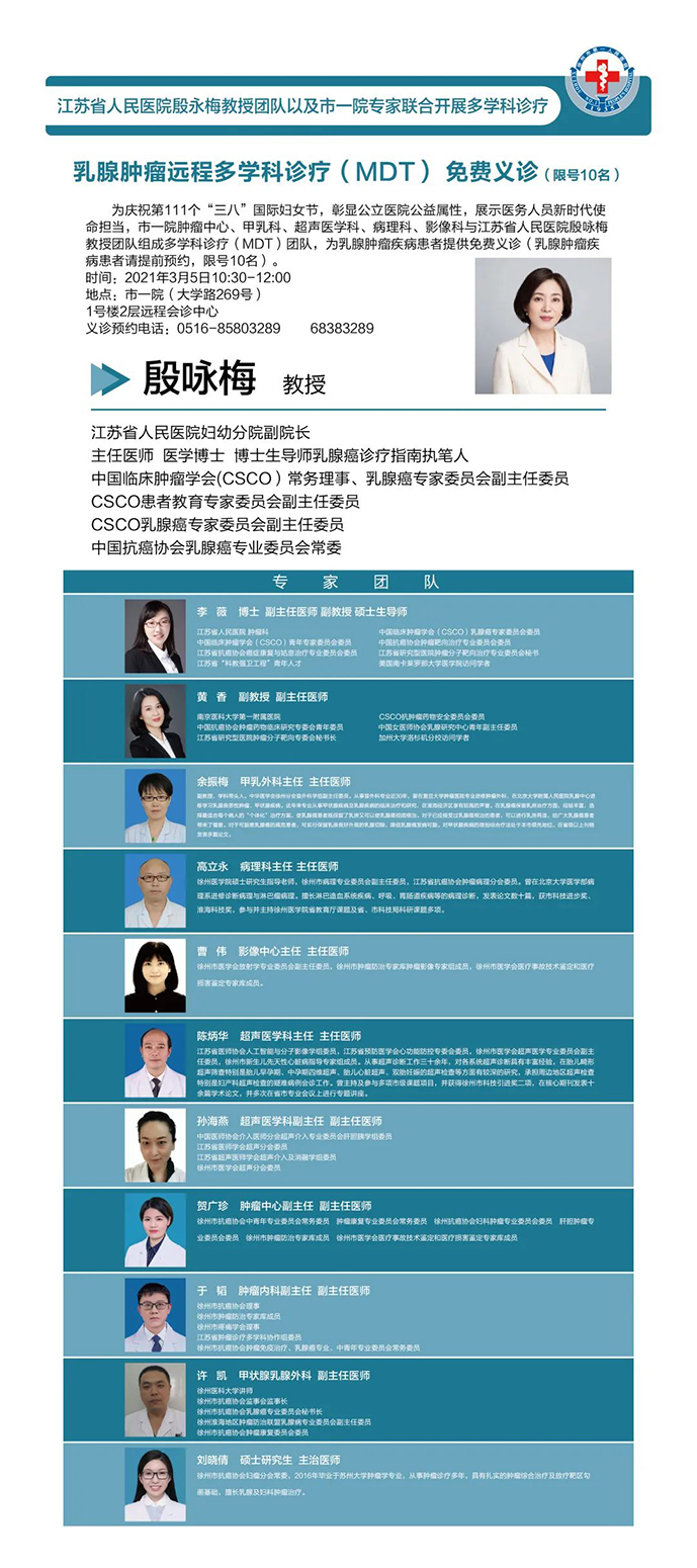 徐州市第一人民醫(yī)院腫瘤中心、甲乳科、超聲醫(yī)學(xué)科、病理科、影像科與江蘇省人民醫(yī)院殷詠梅教授團(tuán)隊組成多學(xué)科診療(MDT)團(tuán)隊,為乳腺腫瘤疾病患者提供免費(fèi)義診(乳腺腫瘤疾病患者請?zhí)崆邦A(yù)約,限號10名)。