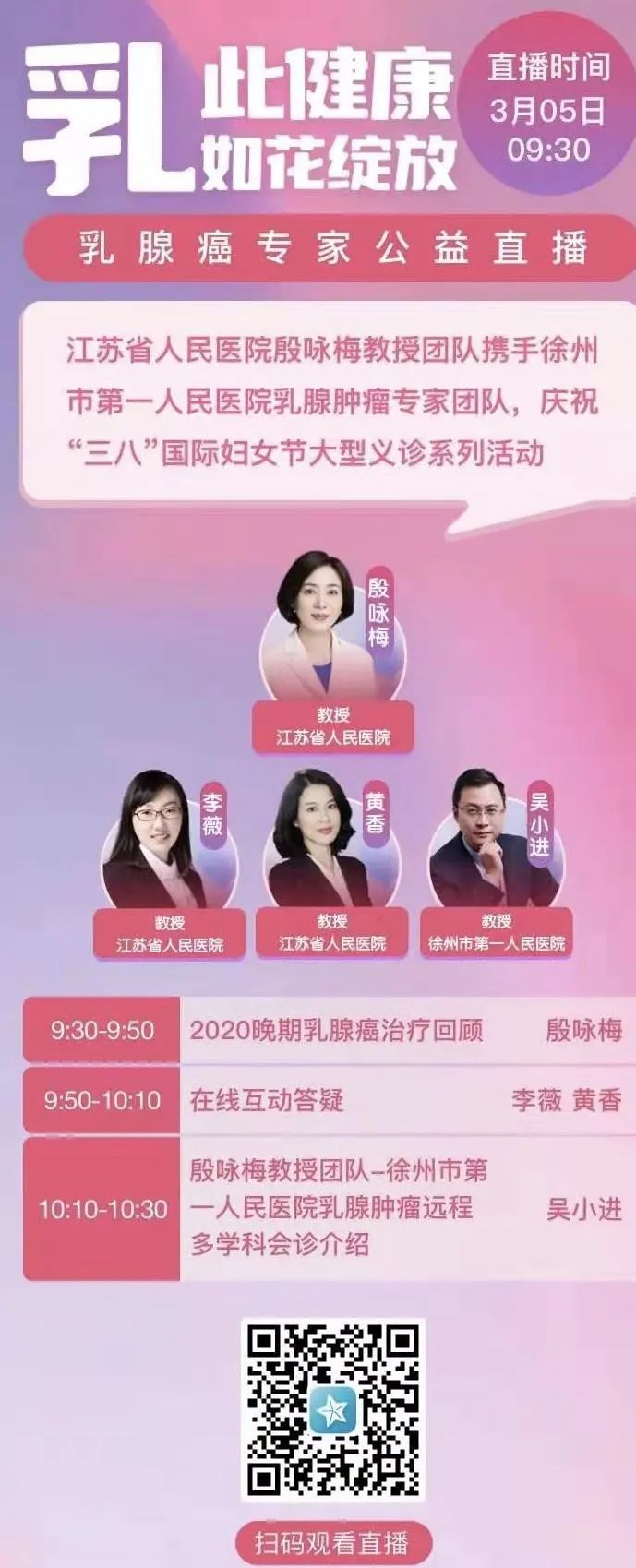 黃淮網(wǎng)( 盧 碩) 為迎接2021年“三八”國際婦女節(jié),提高廣大女性自我健康管理意識,彰顯公立醫(yī)院公益屬性,展示醫(yī)務(wù)人員新時代使命擔(dān)當(dāng),江蘇省人民醫(yī)院殷詠梅教授團(tuán)隊攜手徐州市第一人民醫(yī)院乳腺腫瘤專家團(tuán)將于2021年3月5日上午舉行“乳此健康,如花綻放”大型義診及健康公益直播活動。屆時,將提供免費(fèi)的義診診療服務(wù)及公益直播,歡迎您的到來。