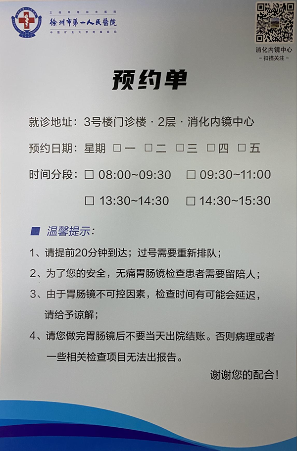 徐州市第一人民醫(yī)院女性VIP胃腸鏡專場預(yù)約檢查流程