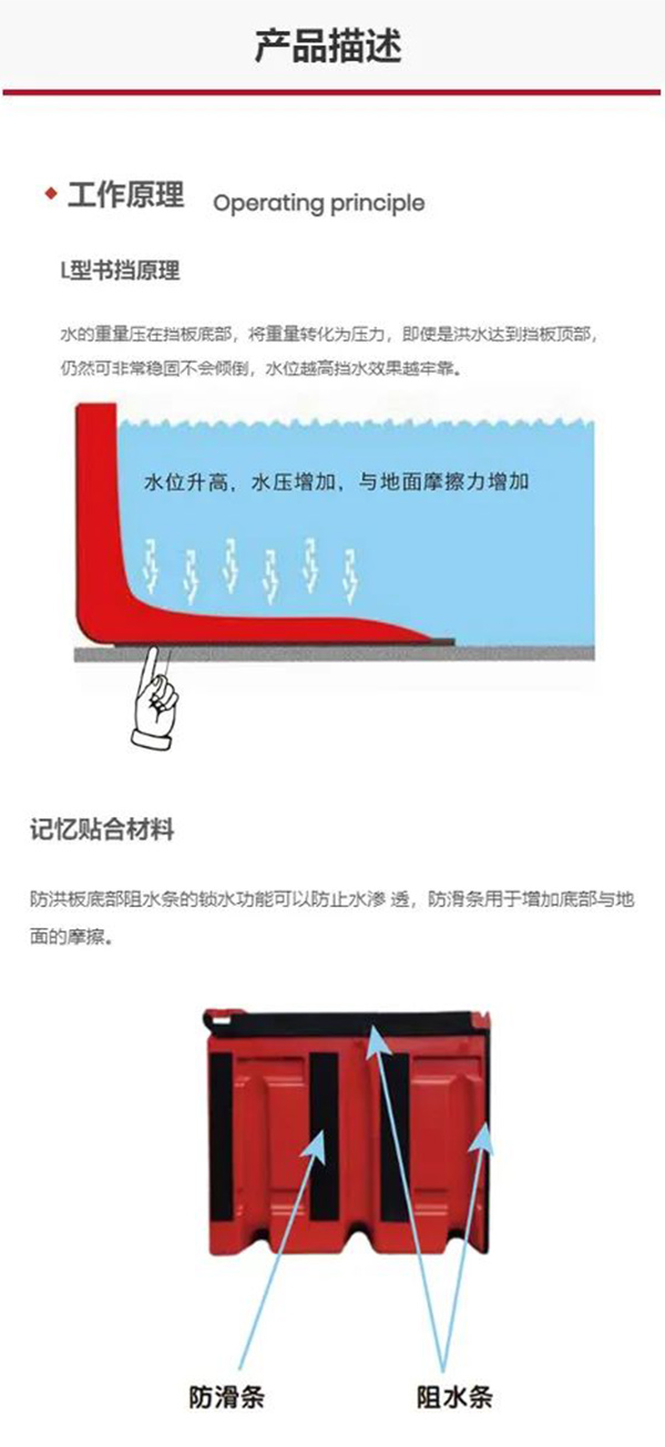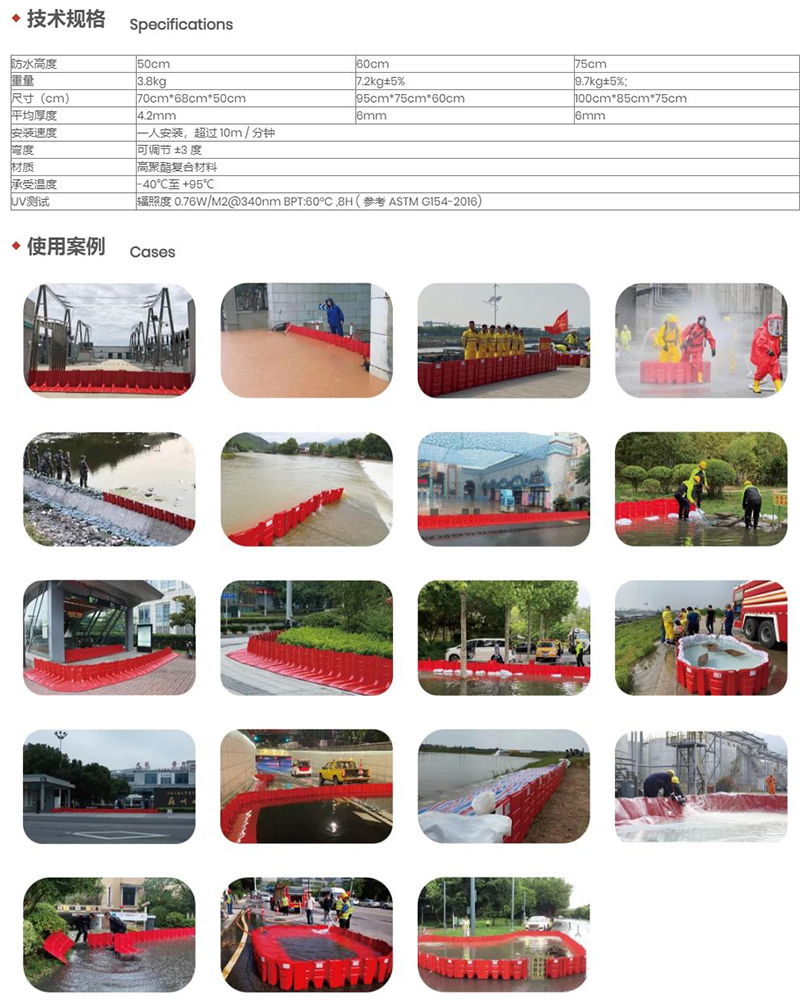由國(guó)家水利部、交通運(yùn)輸部、國(guó)家能源局等部門(mén)共同研發(fā)并獲得國(guó)家專(zhuān)利產(chǎn)品的L型擋水板,是一種攔截和防護(hù)瞬間發(fā)生的暴雨洪水利器,每塊擋板可抵御50公分至1米高的水位,其主要特點(diǎn)是輕巧靈活不需要固定鋪設(shè),安裝迅速,省時(shí)省力,可重復(fù)使用。擋板材質(zhì)采用高聚酯復(fù)合材料,結(jié)構(gòu)設(shè)計(jì)上采用L型書(shū)檔原理,底部覆蓋阻水膠棉和防滑條,是一種可獨(dú)自支撐站立的應(yīng)急性防水設(shè)施。可根據(jù)需要組合成不同的形狀,避免傳統(tǒng)沙袋安裝需要耗費(fèi)大量人力搬運(yùn)及無(wú)法循環(huán)使用的困擾,可有效阻絕暴雨的侵襲,主要應(yīng)用于城市道路、地鐵車(chē)站、建設(shè)施工、廠(chǎng)房物業(yè)、應(yīng)急管理等場(chǎng)所或部門(mén)。在全國(guó)防汛領(lǐng)域獲得廣泛應(yīng)用,并已出口20余國(guó)家和地區(qū)。