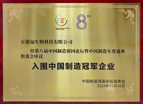 2023年11月26日,由中國制造強(qiáng)國論壇組委會(huì)、河北省工業(yè)和信息化廳、保定市人民政府主辦的“第八屆中國制造強(qiáng)國論壇”在河北省保定市隆重舉行。百德福生物科技有限公司應(yīng)邀出席論壇,并榮獲“入圍中國制造冠軍企業(yè)”榮譽(yù)稱號(hào)。
