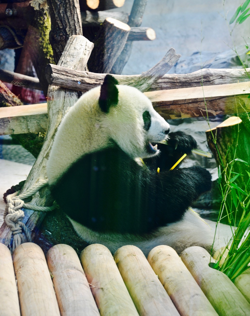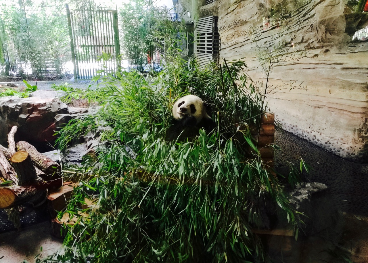 進(jìn)了園子順著右側(cè)的主路不過200米就來到了熊貓館。門口可是專門有幾名警察大漢把守的。進(jìn)了熊貓館正中就是熊貓餐廳,一群德國人正圍在玻璃窗前。我扒拉開人群,果不其然熊貓正在吃早餐呢。好嘛!你看那個(gè)吃相,坐在一圈嫩竹子中間撇著大嘴大吃特吃。這么多人看著你也不知道收斂些,好像在中國老餓著你是的。