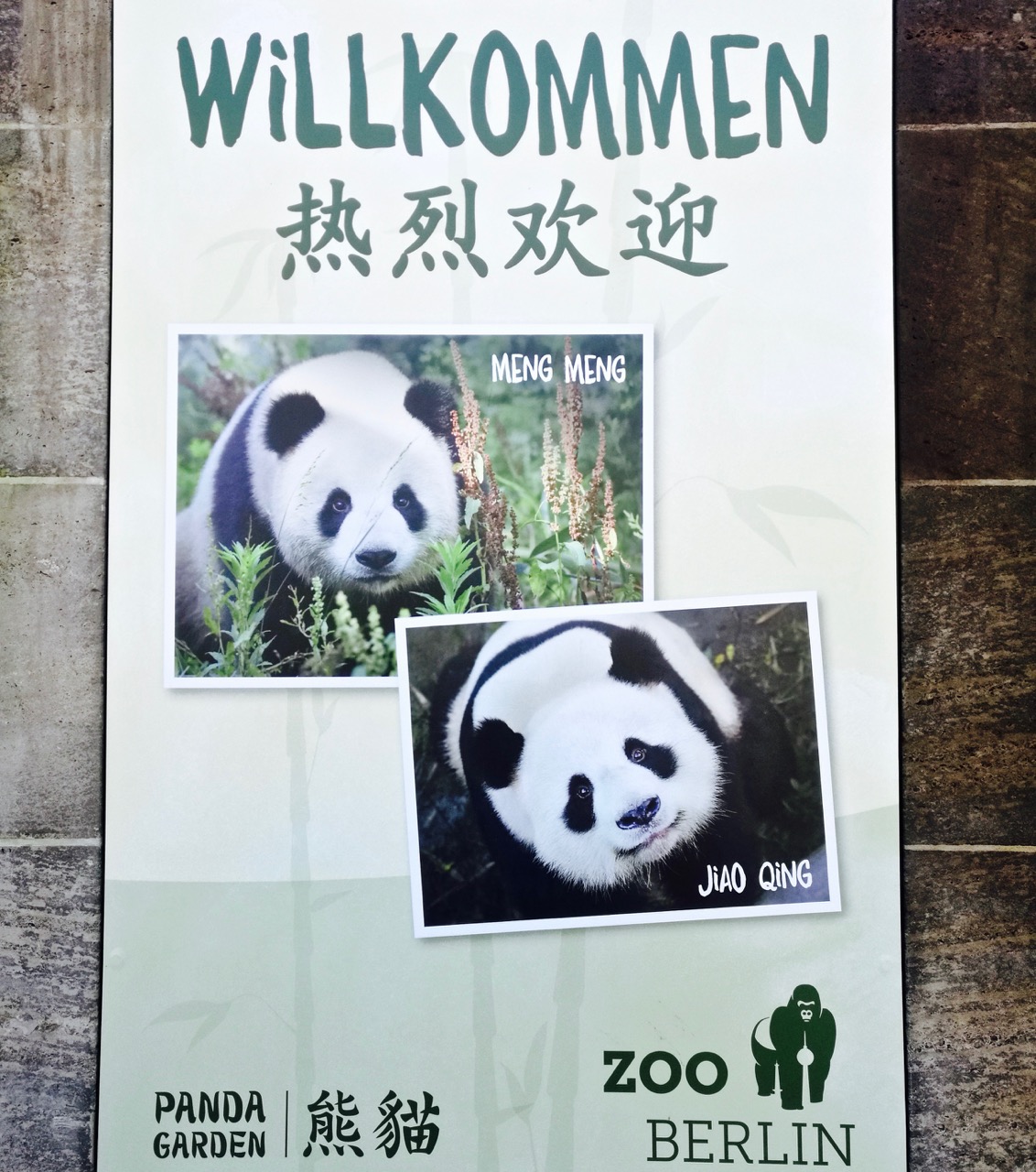 周日一大早趕到柏林動物園看大熊貓,我這真是跨越萬水千山來看你啊。遠(yuǎn)遠(yuǎn)就看到了大門口貼著印有中文字的大熊貓海報(bào),兩只熊貓的名字標(biāo)注的是拼音。