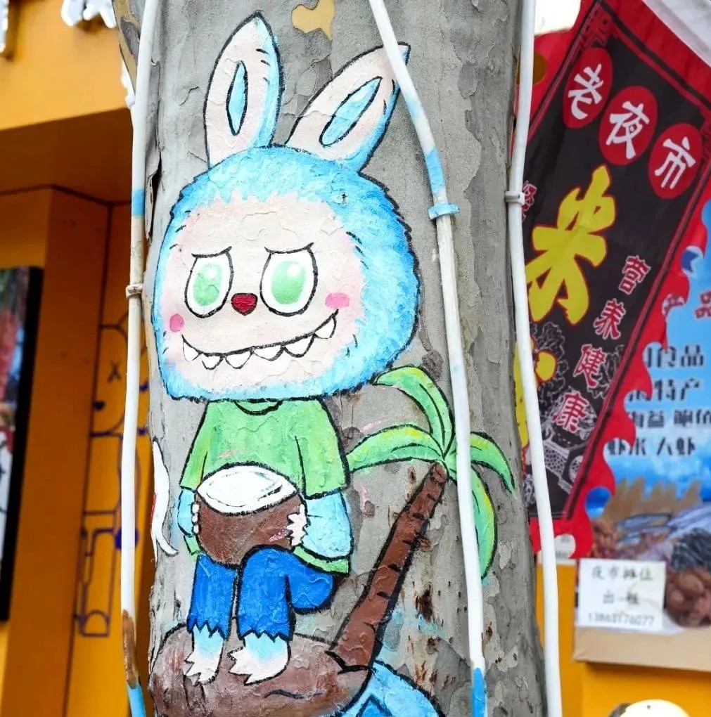 威海東城路夜市的樹最近成了“大明星”!樹干上,史迪奇拉布布一臉俏皮,米奇拉布布笑容燦爛,Tycoco帶著獨特的萌態(tài),讓人忍不住多看幾眼……
