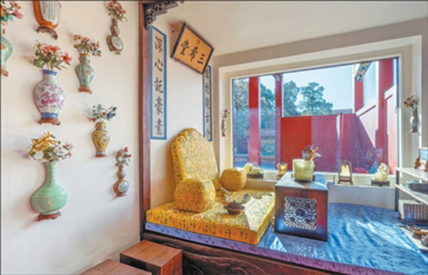 聞名遐邇的三希堂,位于養(yǎng)心殿內(nèi)西暖閣,原為乾隆的書房,名溫室,后因乾隆年間收藏王羲之《快雪時(shí)晴帖》、王獻(xiàn)之《中秋帖》、王珣《伯遠(yuǎn)帖》三件稀世墨寶而得名,“三希”亦含“士希賢、賢希圣、圣希天”的修身箴言。透過明亮的玻璃,觀眾可以看到,堂內(nèi)墻上還懸掛著各式瓷瓶,瓶中插有寶石花。