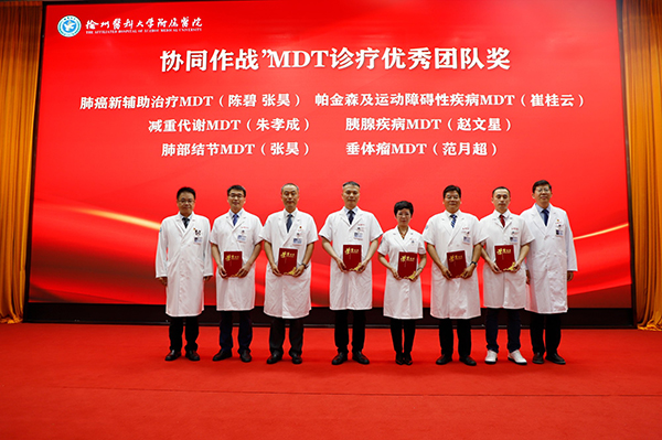 常務副院長顧玉明、副院長楊煜為榮獲“協(xié)同作戰(zhàn)MDT診療優(yōu)秀團隊”的肺癌新輔助治療MDT(陳碧 張昊)、帕金森及運動障礙性疾病MDT(崔桂云)、減重代謝MDT(朱孝成)、胰腺疾病MDT(趙文星)、肺部結節(jié)MDT(張昊)、垂體瘤MDT(范月超)等6個團隊代表頒獎。