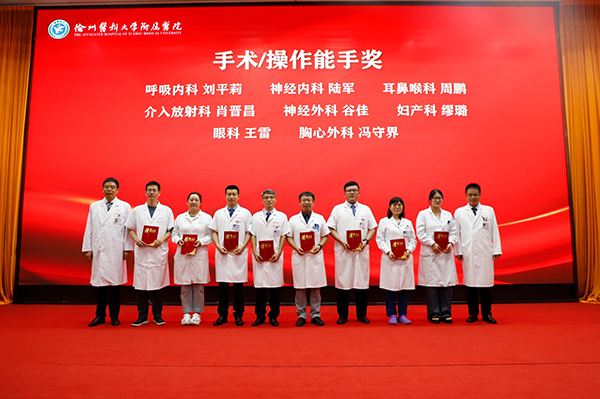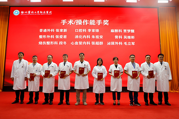 常務副院長顧玉明、黨委副書記王遠清為榮獲“手術/操作能手獎”的普通外科張家新、口腔科李家鋒、麻醉科賈夢醒、整形外科張愛君、消化內(nèi)科朱祖安、骨科吳繼彬、燒傷整形科段冬、心血管內(nèi)科張超群、泌尿外科毛立軍、呼吸內(nèi)科劉平莉、神經(jīng)內(nèi)科陸軍、耳鼻喉科周鵬、介入放射科肖晉昌、神經(jīng)外科谷佳、婦產(chǎn)科繆璐、眼科王雷、胸心外科馮守界等17位醫(yī)師頒獎。
