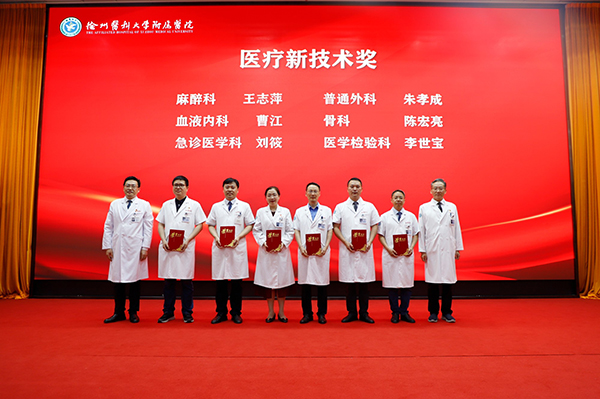 院黨委書記呂凌、院長金培生為榮獲“醫(yī)療新技術獎”的麻醉科王志萍、普通外科朱孝成、血液內(nèi)科曹江、骨科陳宏亮、急診醫(yī)學科劉筱、醫(yī)學檢驗科李世寶等6位醫(yī)師頒獎。