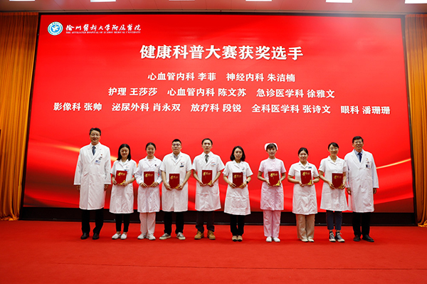 副院長燕憲亮、副院長楊煜為在健康科普大賽中獲獎的心血管內(nèi)科李菲、神經(jīng)內(nèi)科朱潔楠、護理王莎莎、心血管內(nèi)科陳文蘇、急診醫(yī)學科徐雅文、影像科張帥、泌尿外科肖永雙、放療科段銳、全科醫(yī)學科張詩文、眼科潘珊珊等10位選手頒獎。
