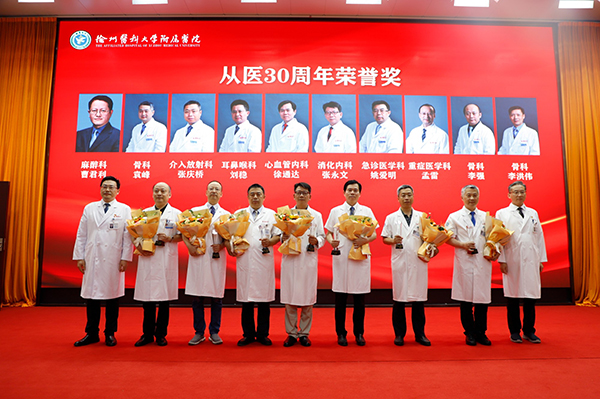 大會表彰了從醫(yī)30周年的麻醉科曹君利、骨科袁峰、介入放射科張慶橋、耳鼻喉科劉穩(wěn)、心血管內(nèi)科徐通達、消化內(nèi)科張永文、急診醫(yī)學科姚愛明、重癥醫(yī)學科孟雷、骨科李強、骨科李洪偉、普外科楊小勇、感染性疾病科丁芹、胸心外科胡波、心血管內(nèi)科王向東、麻醉科王光磊、藥學部劉磊、眼科潘榮海、醫(yī)學檢驗科黃平、病理科顏靜等19位醫(yī)師、醫(yī)技工作者。院黨委書記呂凌、院長金培生為他們頒發(fā)榮譽獎杯和證書。骨科主任袁峰教授作為醫(yī)師代表做了發(fā)言。