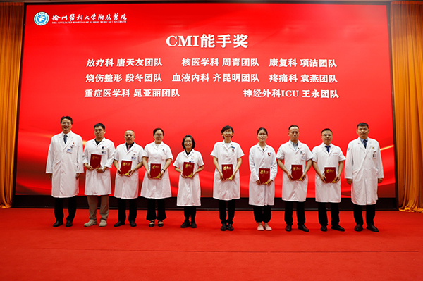 紀委書記談在祥、副院長燕憲亮為榮獲“CMI能手獎”的介入科崔艷峰團隊、神經(jīng)外科馮力團隊、骨科辛兵團隊、泌尿外科朱海濤團隊(移植)、胸外科張偉團隊、普外科姚立彬團隊、心血管內(nèi)科張超群團隊、急診外科姚愛明團隊、神經(jīng)內(nèi)程言博團隊、放療唐天友團隊、核醫(yī)學周青團隊、康復科項潔團隊、燒傷整形科段冬團隊、血液內(nèi)科齊昆明團隊、疼痛科袁燕團隊、重癥醫(yī)學科晁亞麗團隊、神經(jīng)外科ICU王永團隊等17個團隊代表頒獎。